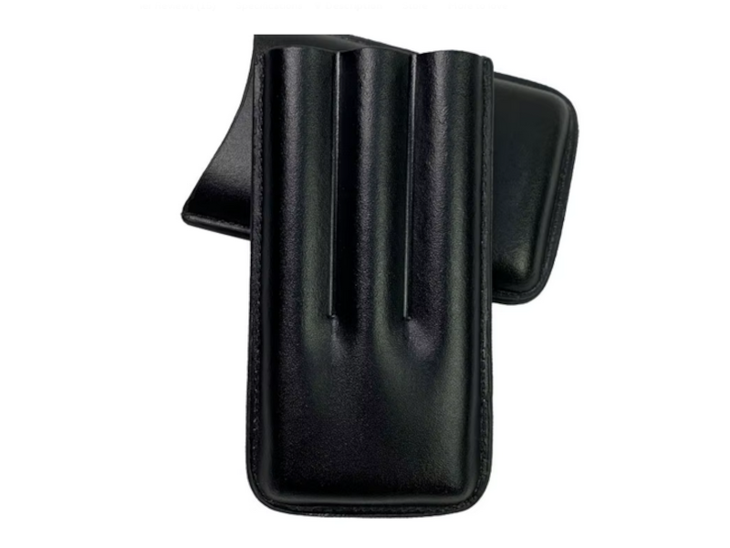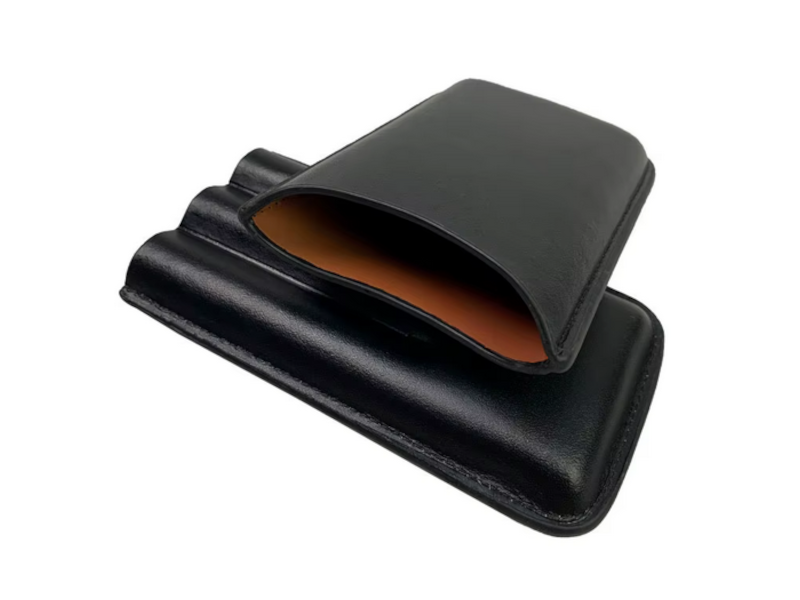 Fekete bőr szivartok, 3 szál Robusto méretű szivar részére. Elegáns, fekete színű, valódi bőrből (vagy prémium bőrből) készült szivartok, amelyet kifejezetten a Robusto formátum kedvelőinek terveztek. Ez a kiegészítő nemcsak stílusos megjelenést kölcsönöz tulajdonosának, hanem maximális védelmet is nyújt a szivaroknak az utazások vagy üzleti megbeszélések során.